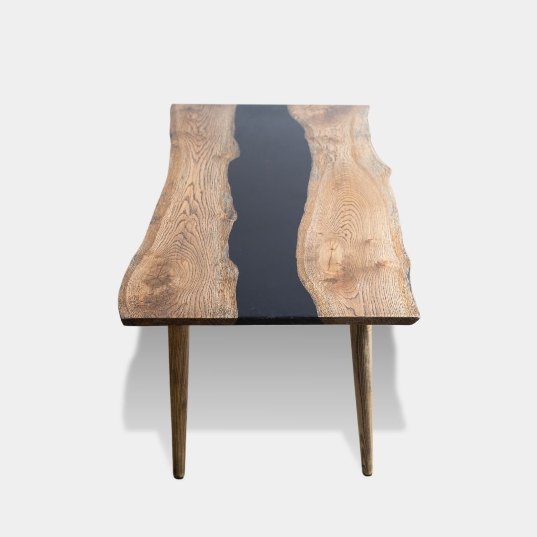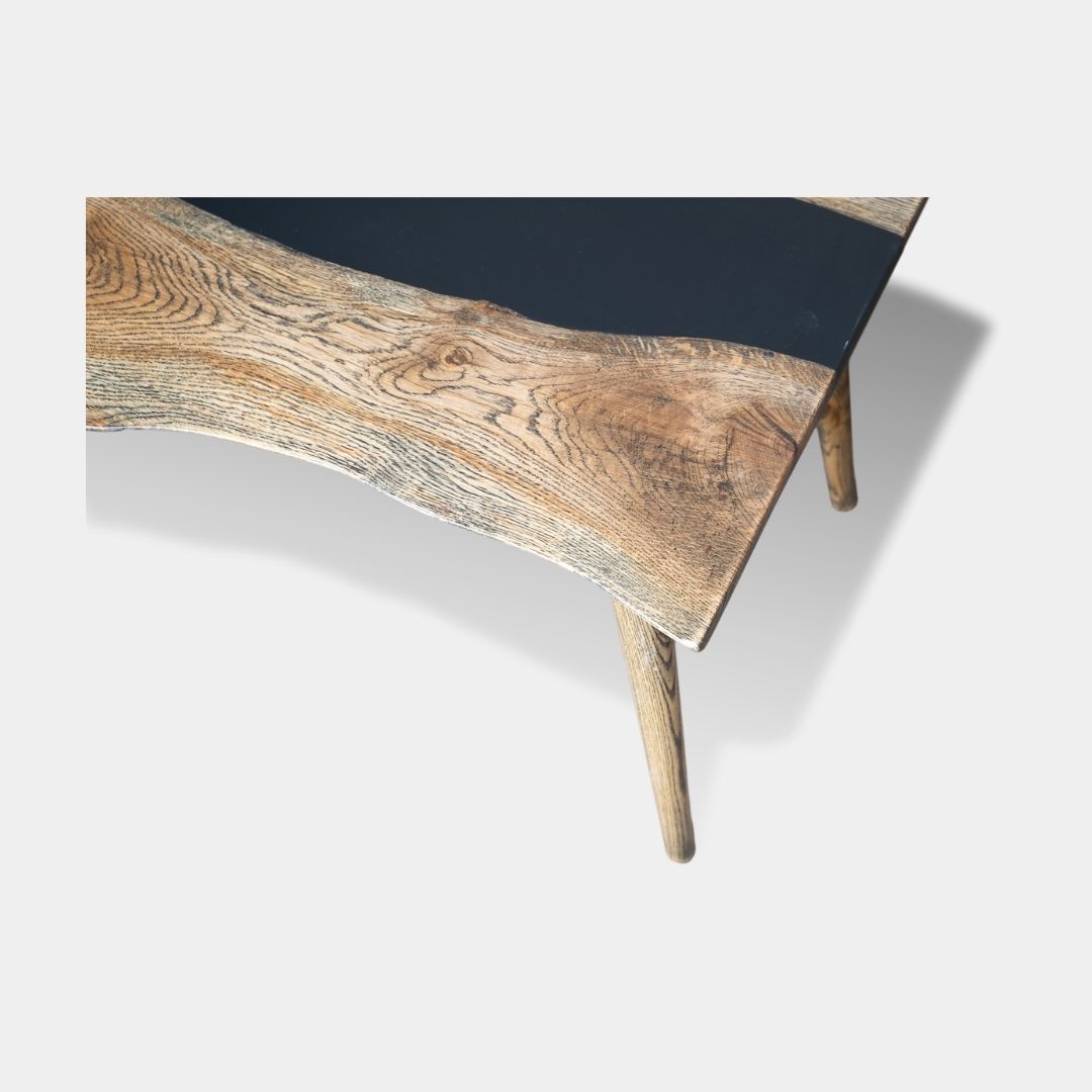 The Black River Resin Coffee Table is a compact statement piece crafted from solid white oak. Featuring a striking black epoxy resin river flowing through the center, it brings a contemporary edge to natural wood. With a length of 3 feet, depth ranging from 18 to 20 inches, and a height of 18 inches, this coffee table fits perfectly in smaller living spaces. The contrast between the warm oak grain and the bold resin detail creates a balanced design that is both modern and timeless.