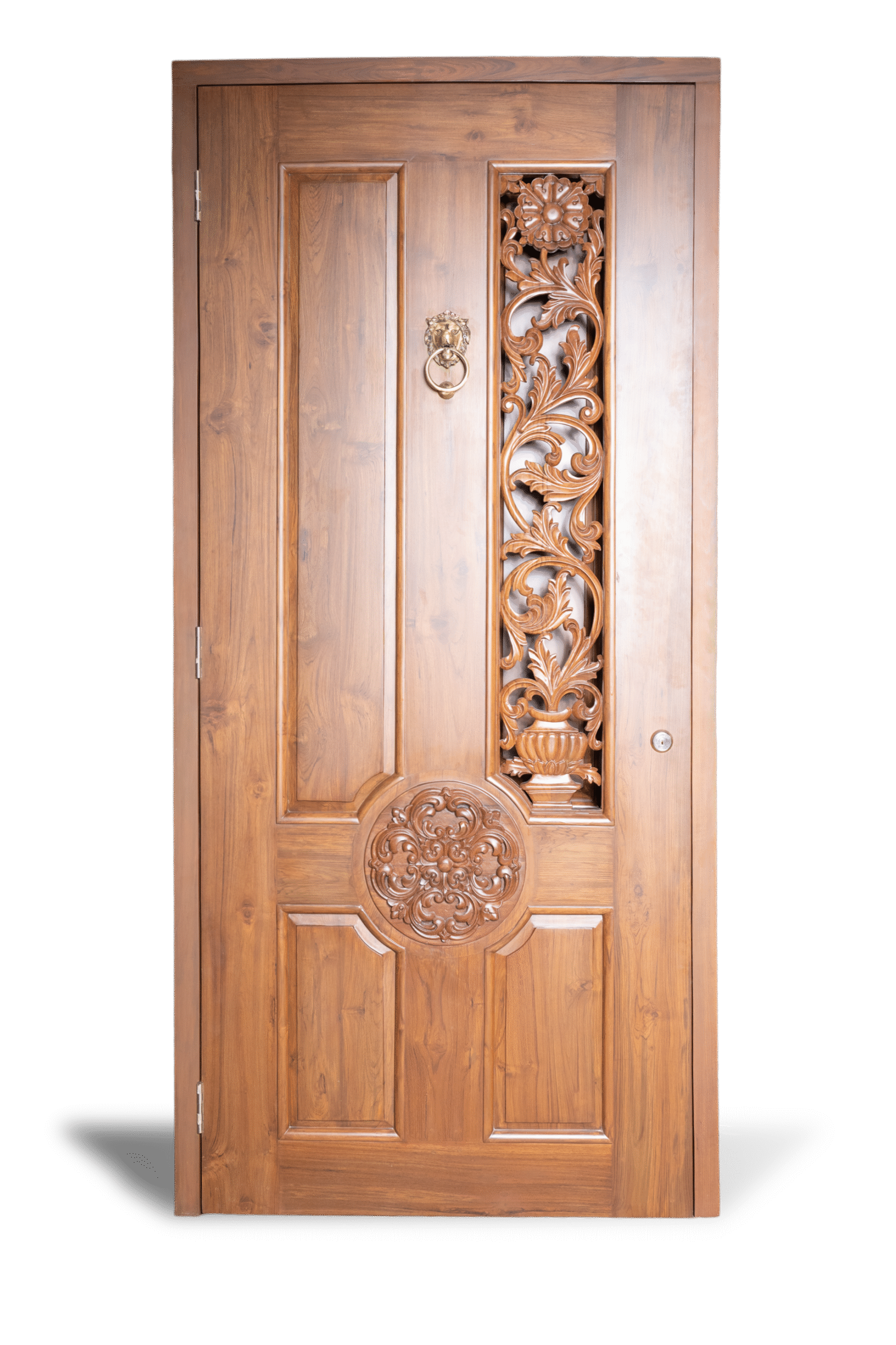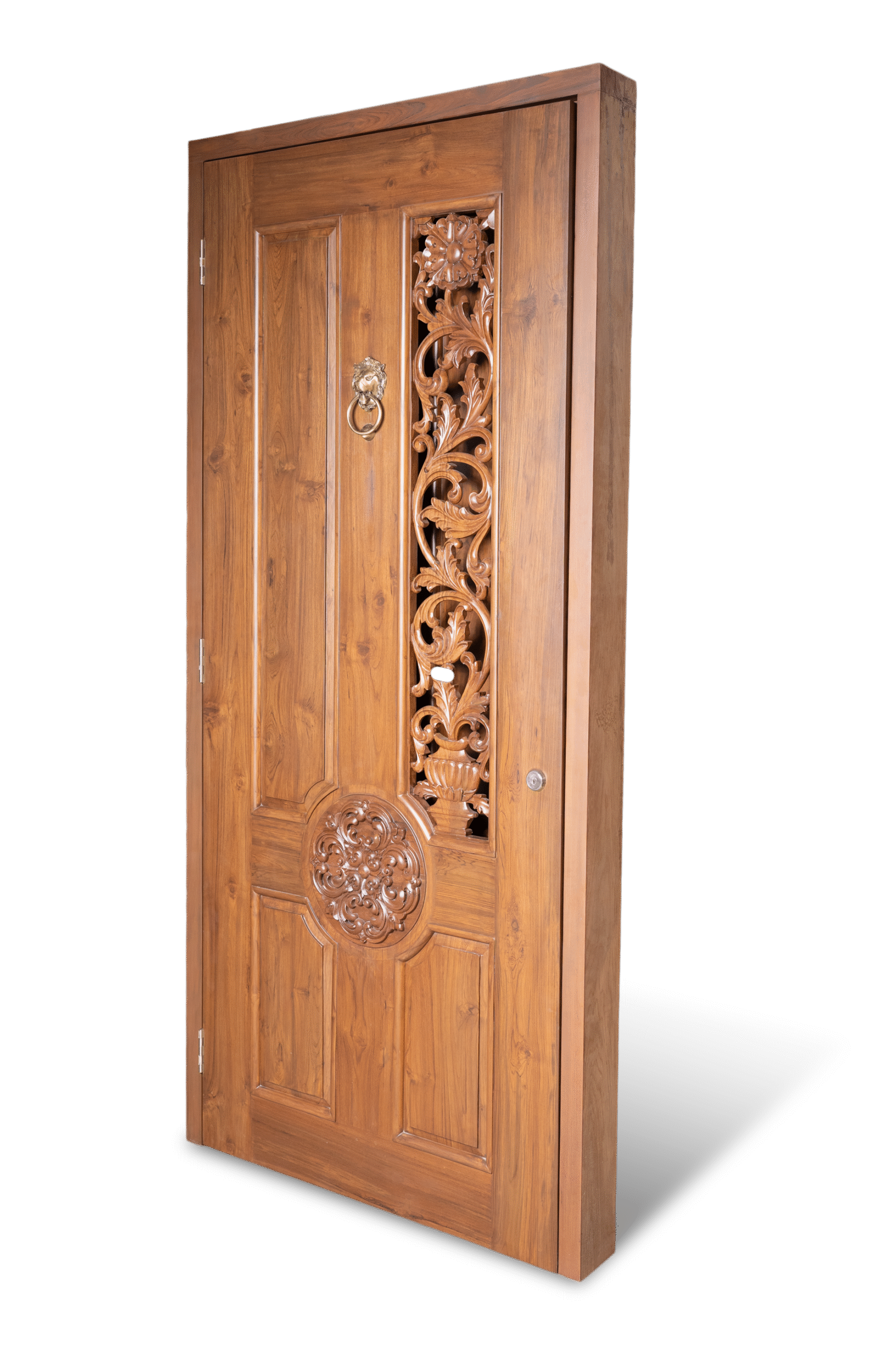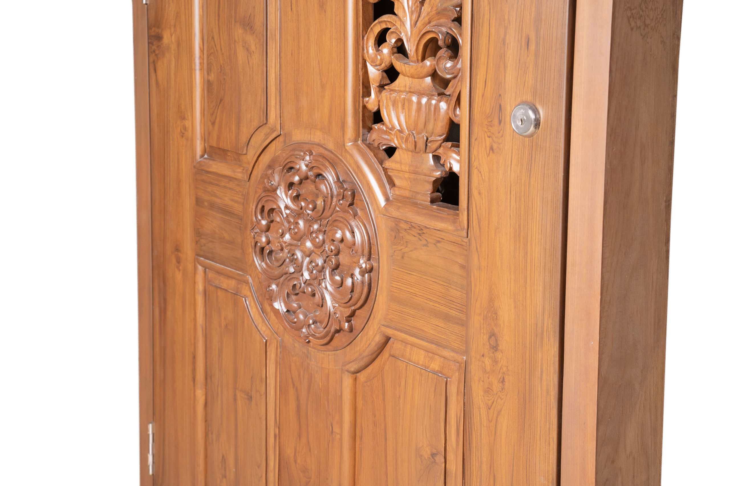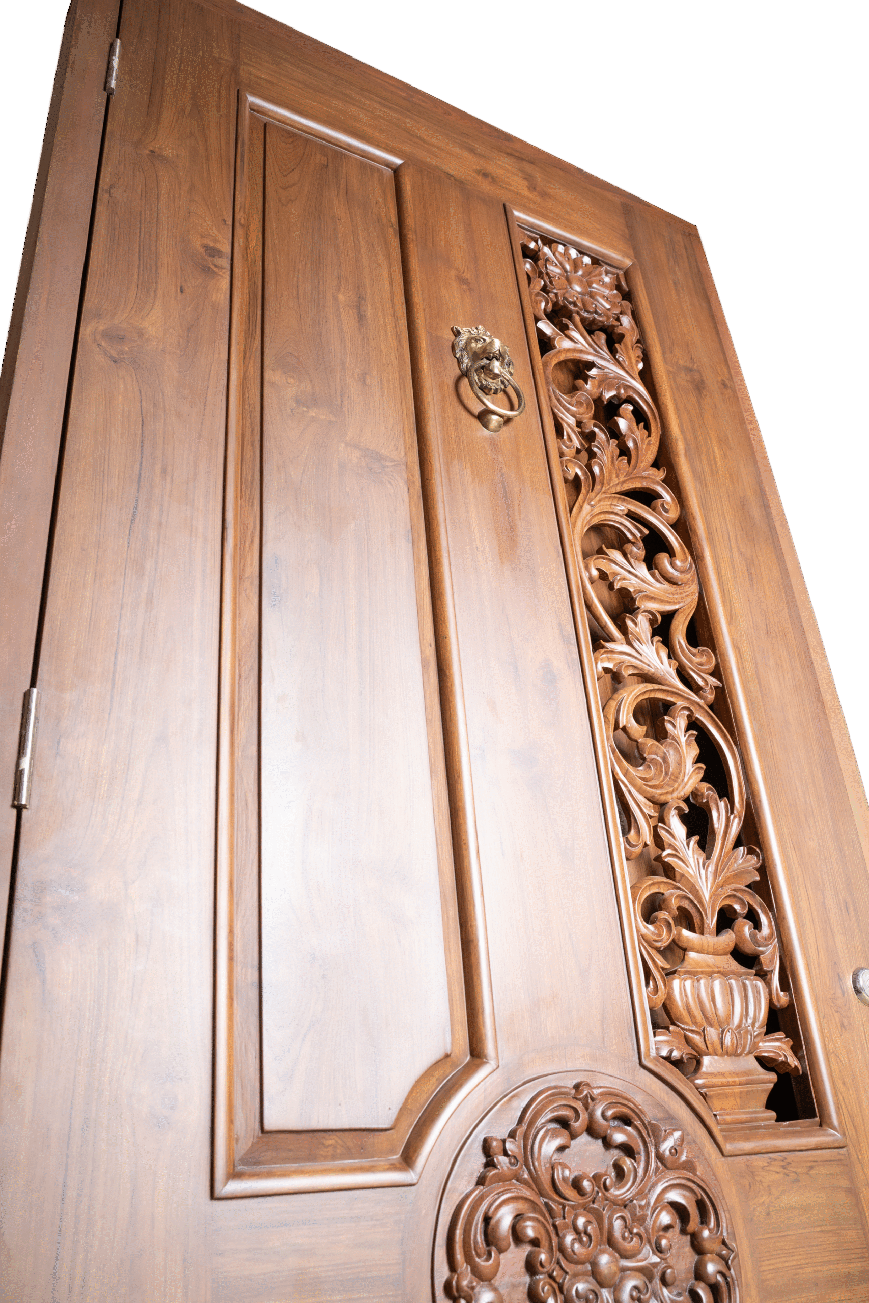.The Carved Door is a beautifully handcrafted double door made entirely from premium Burma teak wood, created for a client in Nagpur. Featuring intricate hand-carved detailing on the safety door, the design highlights a central motif and an additional carving at the bottom centre, both executed with precision and traditional skill. Finished in an interior PU matte polish, the door showcases the natural richness of teak while offering long-lasting durability. Measuring 8 feet by 3 feet with a 1.5-inch thickness, it arrives fully finished and ready for installation, combining craftsmanship, elegance, and strength in one timeless entrance feature.
