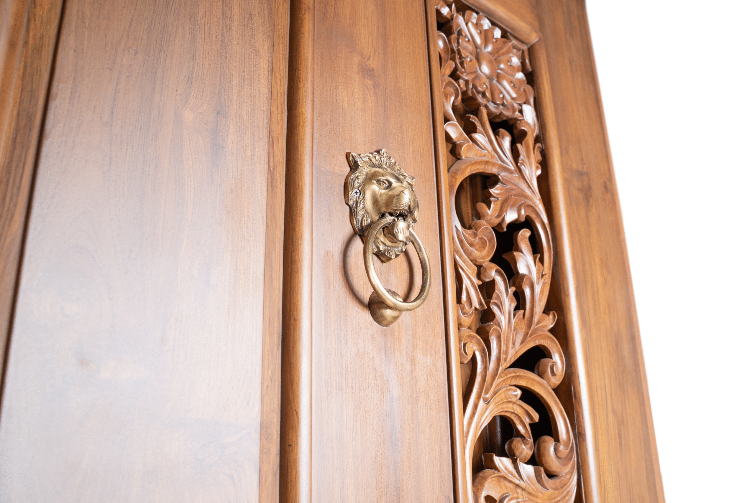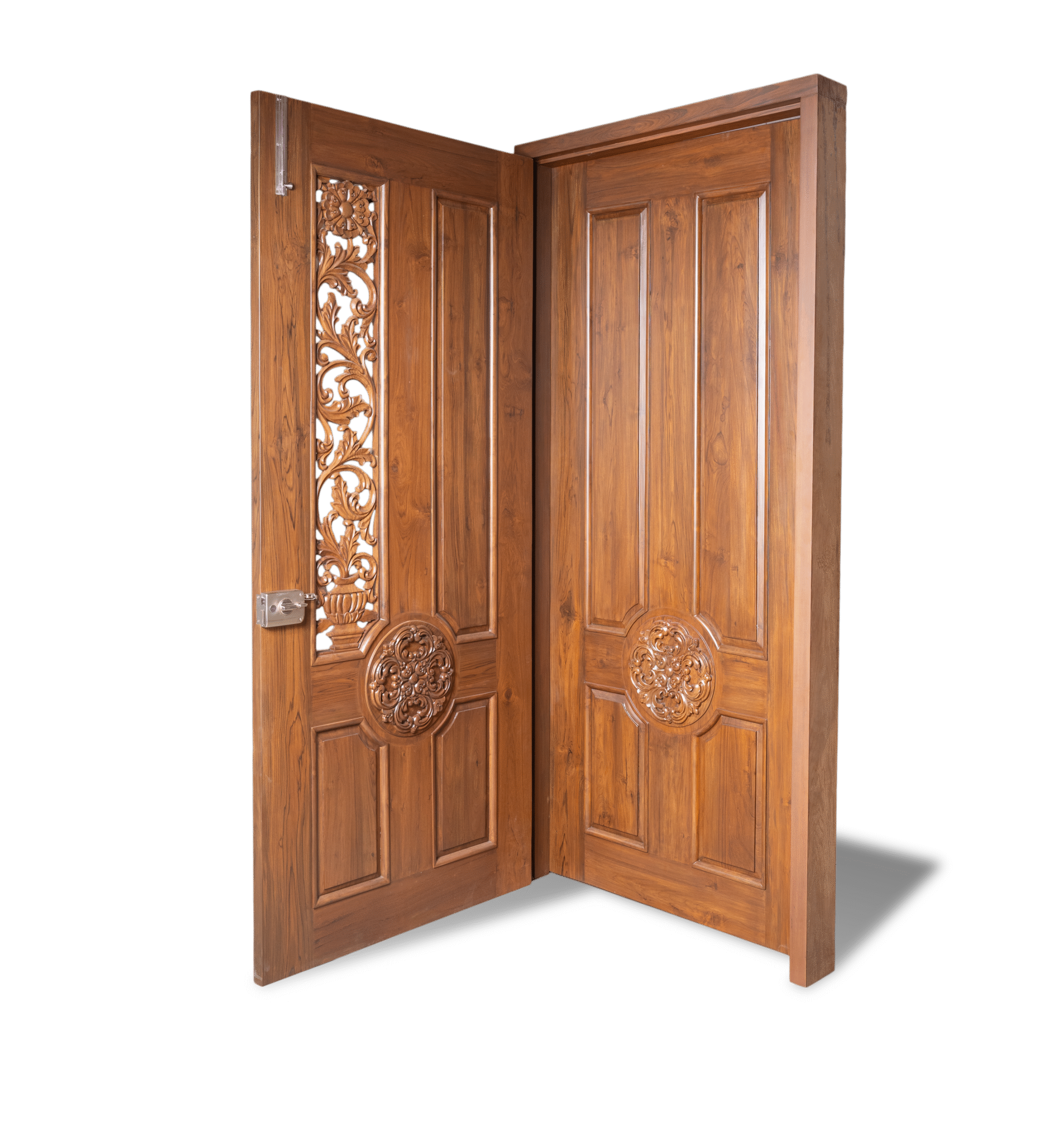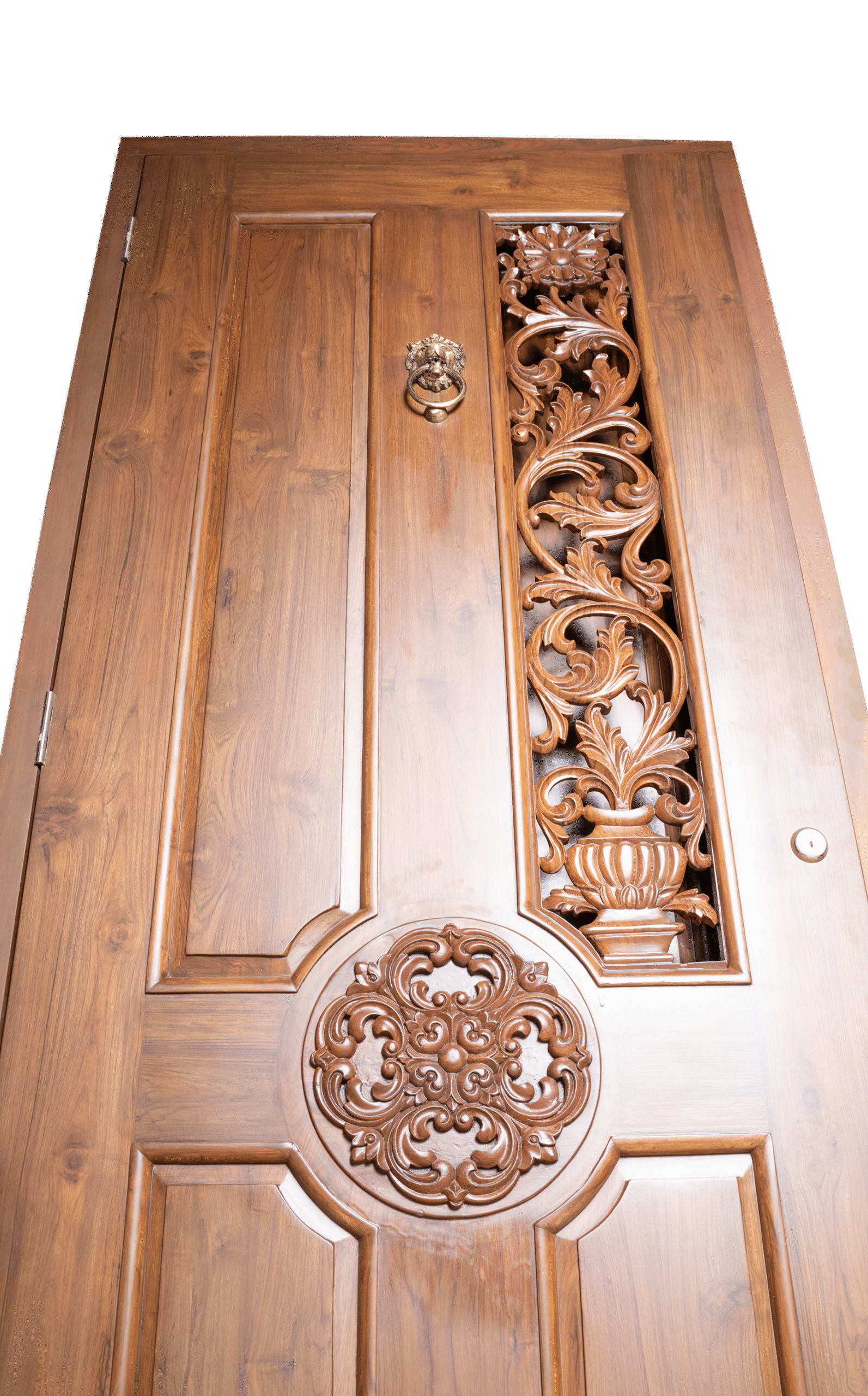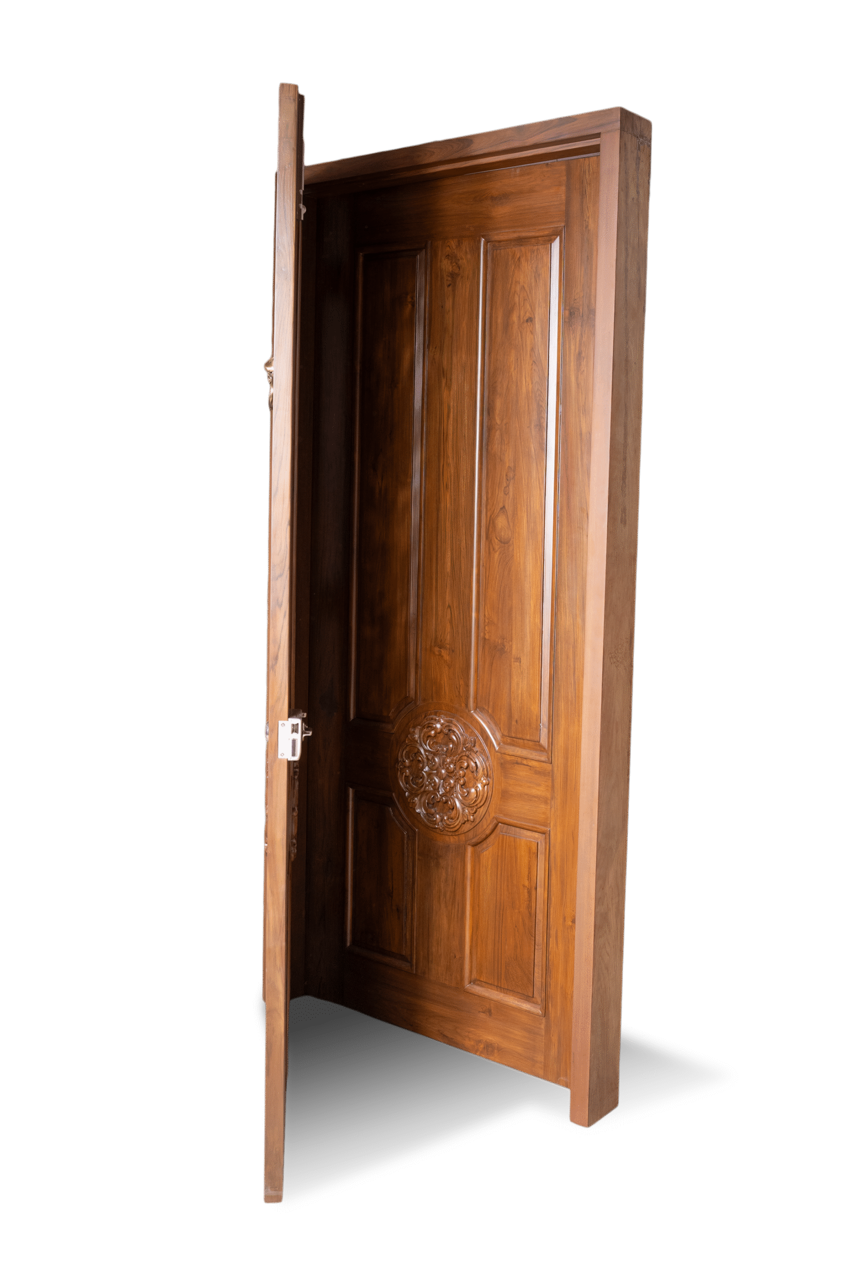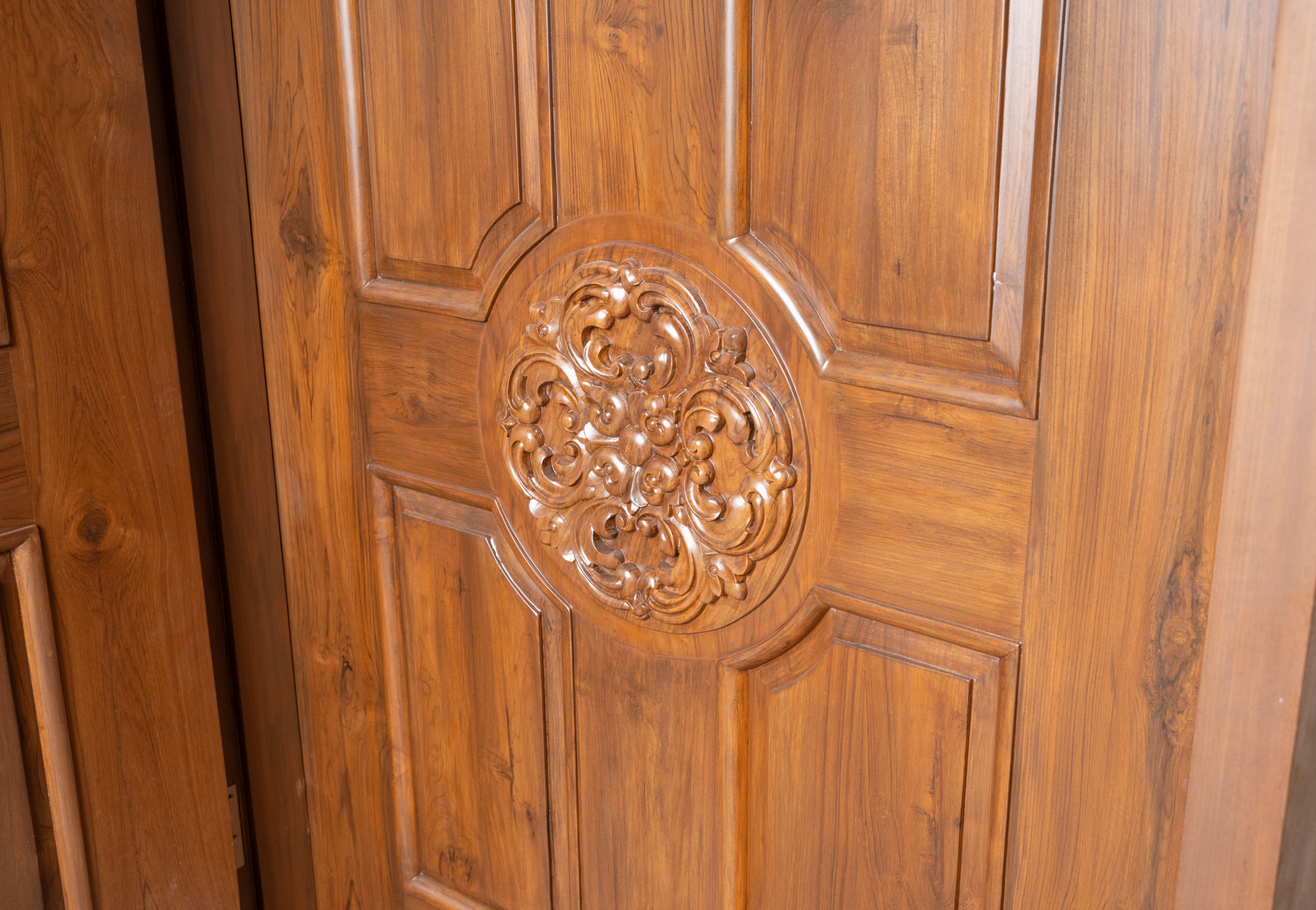.The Carved Door is a beautifully handcrafted double door made entirely from premium Burma teak wood, created for a client in Nagpur. Featuring intricate hand-carved detailing on the safety door, the design highlights a central motif and an additional carving at the bottom centre, both executed with precision and traditional skill. Finished in an interior PU matte polish, the door showcases the natural richness of teak while offering long-lasting durability. Measuring 8 feet by 3 feet with a 1.5-inch thickness, it arrives fully finished and ready for installation, combining craftsmanship, elegance, and strength in one timeless entrance feature.