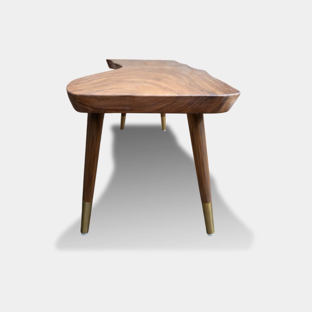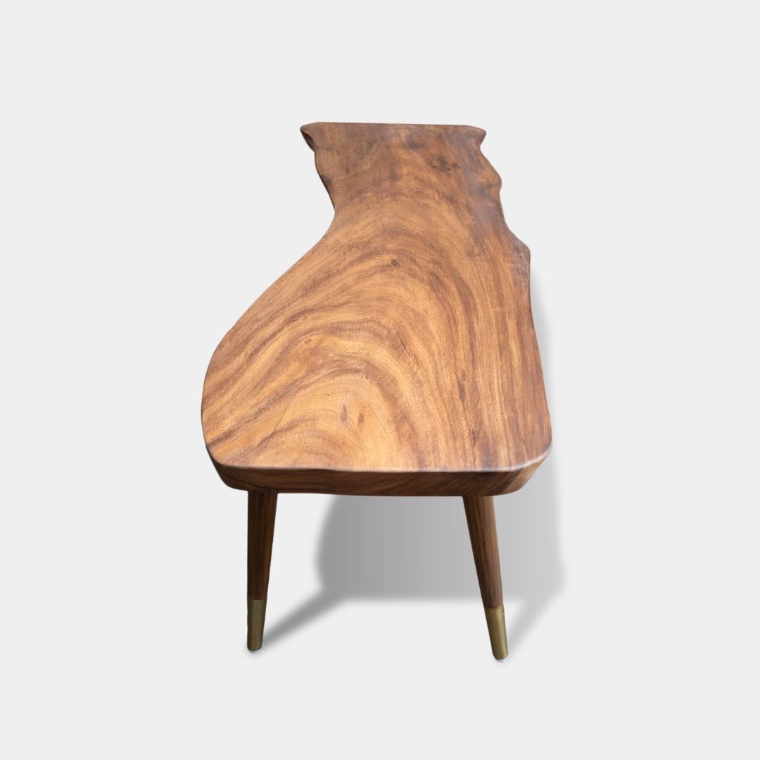 The Live Metal Bench is crafted from East Indian walnut wood and finished with an interior PU matte polish for a rich, natural look. Measuring 4.5 feet in length, 16 inches in width, and 18 inches in height, it offers a sleek and well-balanced profile. The metal caps on the legs add a subtle contemporary detail while enhancing durability. This bench works beautifully in living areas, entryways, or at the foot of a bed, making it a practical yet visually striking piece.